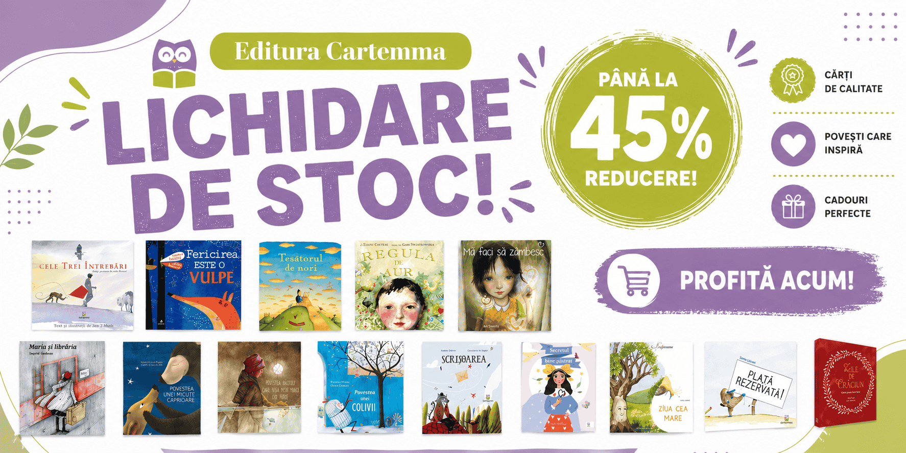 Librăria noastră aduce atât titluri consacrate din literatura internațională, cât și cărți unice, publicate de propria editură. Nu aștepta sărbatorile sau zilele de naștere pentru a cumpăra sau a dărui cărți celor mici - orice moment este perfect pentru educație, lectură sau povești, pentru joacă sau activități distractive!