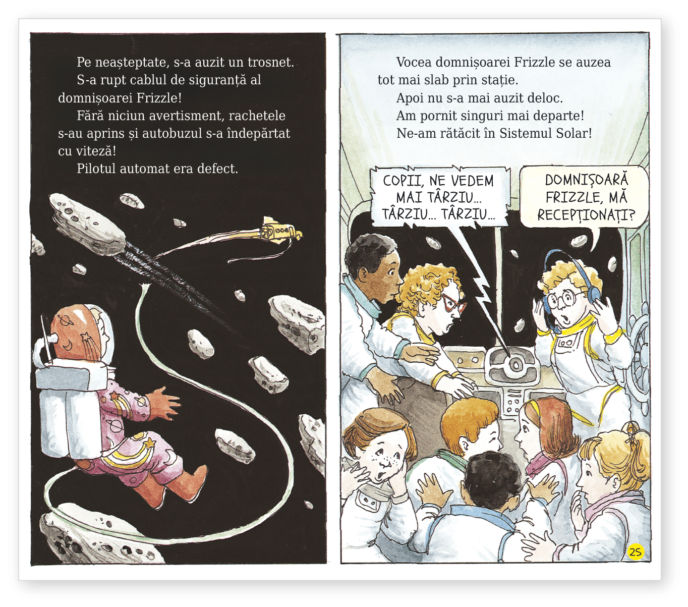 Excursia este anulată atunci când profesoara și clasa ei ajung la planetariu și îl găsesc închis pentru reparații. Ce dezamăgire! Dar domnișoara Frizzle are o idee mult mai bună care, ca întotdeauna, depășește așteptările tuturor. Autobuzul școlar magic se transformă într-o navă spațială și îi poartă pe copii într-o excursie prin atmosferă și chiar dincolo de aceasta, până la Lună, iar apoi prin întregul Sistem Solar. Totuși, excursia nu este lipsită de peripeții. Din cauza unei defecțiuni tehnice, domnișoara Frizzle dispare printre asteroizi, iar copiii rătăcesc singuri în călătoria lor prin Univers. Vor reuși ei să o găsească pe domnișoara Frizzle și să se întoarcă acasă cu bine?